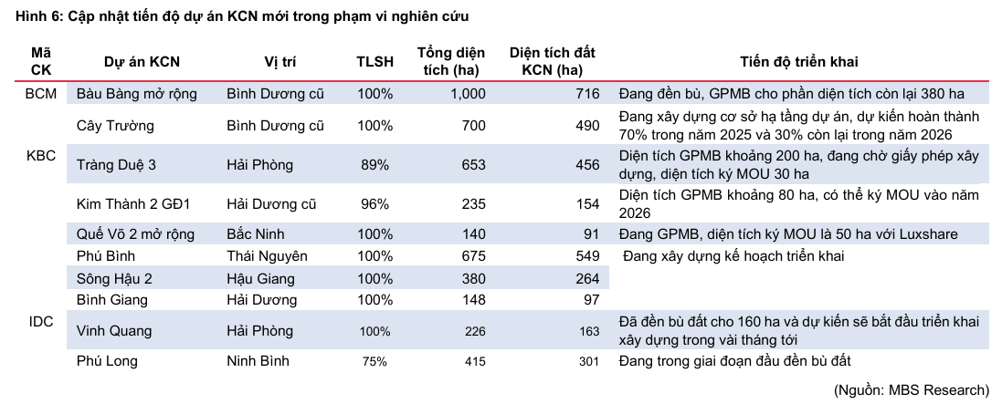 Cụ thể, KBC được phê duyệt thêm 6 KCN mới, tăng thêm 2,200 ha đất KCN. Tổng công ty Becamex (BCM) có thêm hơn 1,000 ha tại KCN Cây Trường và Bàu Bàng mở rộng. IDC được bổ sung thêm 640 ha tại KCN Vinh Quang và Phú Long, đây là nền tảng vững chắc cho tăng trưởng trung hạn của công ty.