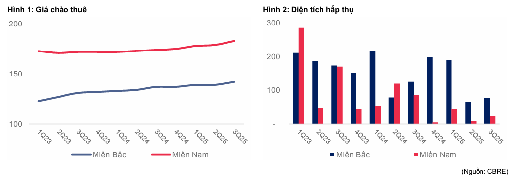 Trong khi đó, các đối thủ cạnh tranh thu hút FDI như Ấn Độ phải chịu mức thuế suất lên tới 50%, và Trung Quốc chịu mức thuế quan trung bình dự kiến khoảng 47%, càng củng cố vị thế của Việt Nam. Thực tế cho thấy thị trường KCN đã có dấu hiệu phục hồi trong Quý 3/2025, với giá chào thuê trung bình tăng 4% so với cùng kỳ và diện tích hấp thụ cũng tăng trở lại. Khách thuê đã quay trở lại đàm phán và nhận bàn giao đất sau khi Mỹ công bố thuế suất áp dụng.