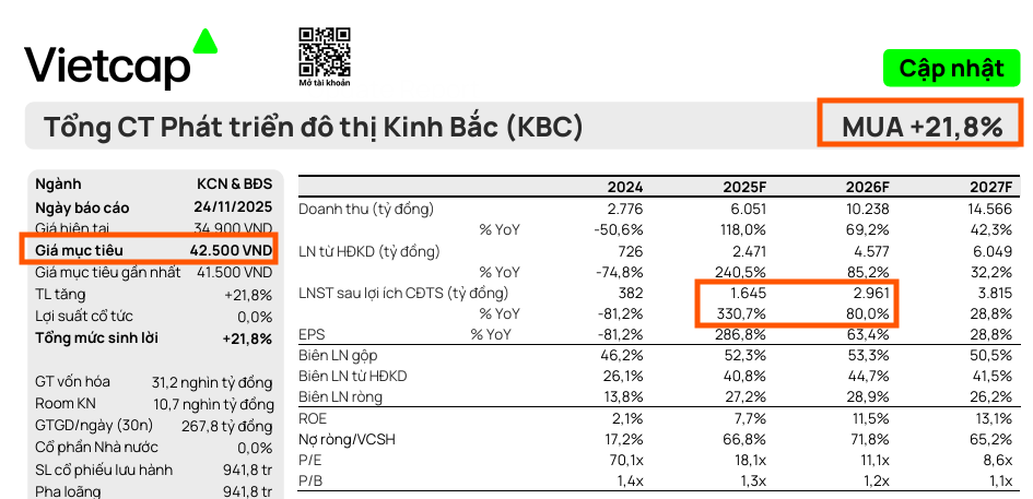 Vietcap (24.11.2025) điều chỉnh tăng giá mục tiêu KBC thêm 2% lên 42,500 đồng/cổ phiếu, chủ yếu nhờ định giá cao hơn của KĐT Tràng Cát sau khi KBC đã thanh toán xong tiền sử dụng đất.