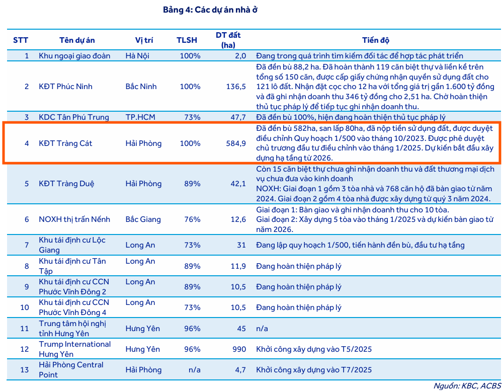 1. Mảng Khu Đô Thị (KĐT) Tràng Cát Bắt Đầu Đóng Góp: Dự án KĐT Tràng Cát (Hải Phòng, 585 ha) dự kiến được mở bán và bàn giao trong năm 2026. Đây là động lực tăng trưởng trung và dài hạn quan trọng. Vietcap dự phóng KBC sẽ bán sỉ khoảng 12 ha tại dự án này trong năm 2026. Dự án KĐT Tràng Cát có tiềm năng hấp thụ mạnh mẽ do đã hoàn tất thủ tục pháp lý, giải phóng mặt bằng, và KBC đã nộp tiền sử dụng đất, với giá vốn thấp do được đầu tư từ năm 2006. Dự báo diện tích bàn giao đất KĐT sẽ tăng tốc từ 5.0 ha năm 2025 lên 17.3 ha năm 2026 và 34.0 ha năm 2027.