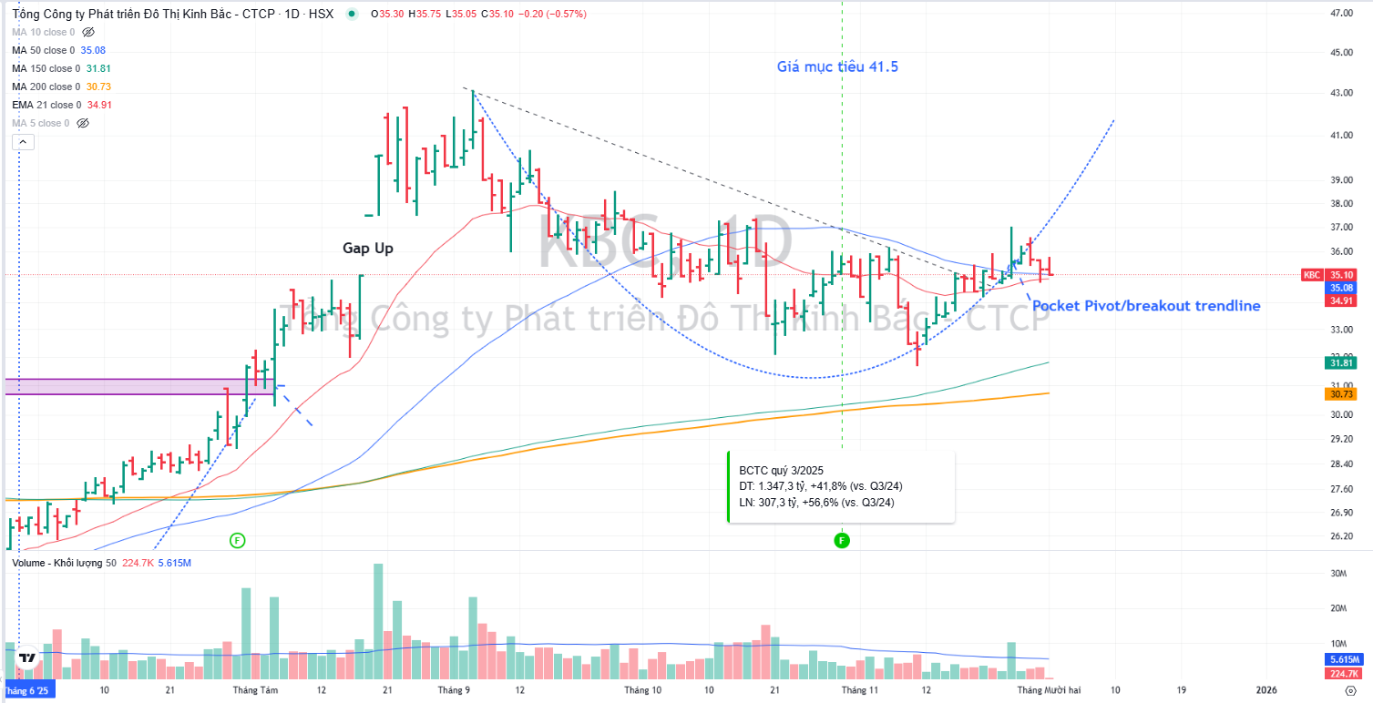 Sau điểm mua Pocket Pivot, đồng thời breakout đường trendline giảm giá vào ngày 25.11.2025, cổ phiếu KBC đang tích lũy với thanh khoản thấp. Elibook Team kỳ vọng cổ phiếu KBC có thể tiếp tục tăng giá.