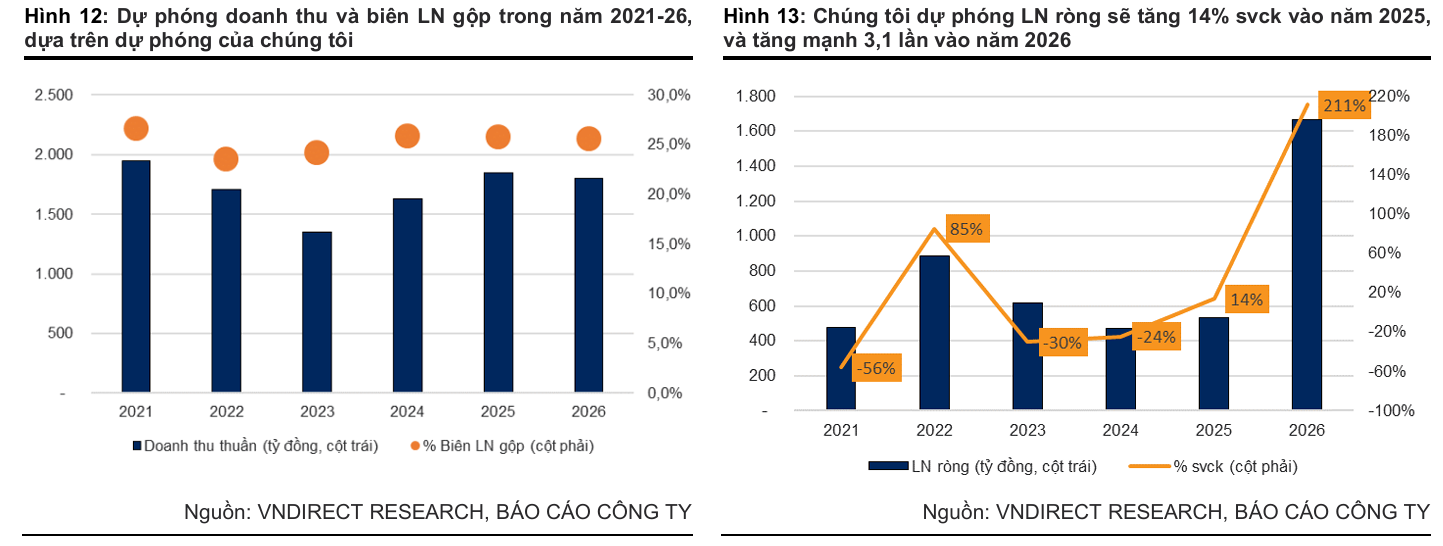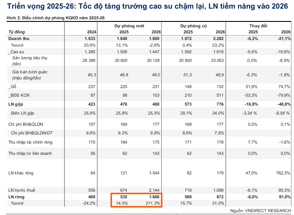 VNdirect điều chỉnh dự phóng Lợi nhuận ròng năm 2025 giảm 6%, đạt 535 tỷ đồng, do mảng cao su chậm lại. Tuy nhiên, Lợi nhuận ròng năm 2026 dự phóng tăng mạnh 91%, đạt 1,666 tỷ đồng, nhờ khoản bồi thường đáng kể từ Bắc Tân Uyên I.