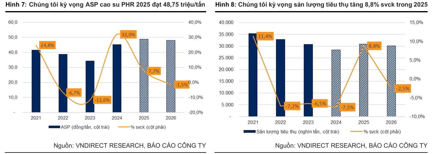 VNdirect dự phóng thị trường cao su sẽ tiếp tục hạ nhiệt trong giai đoạn cuối năm 2025 và năm 2026. Do đó, công ty chứng khoán này đã điều chỉnh giảm 3.6% Giá bán bình quân (ASP) cao su cho năm 2025–2026 và giảm 9% sản lượng tiêu thụ năm 2026.