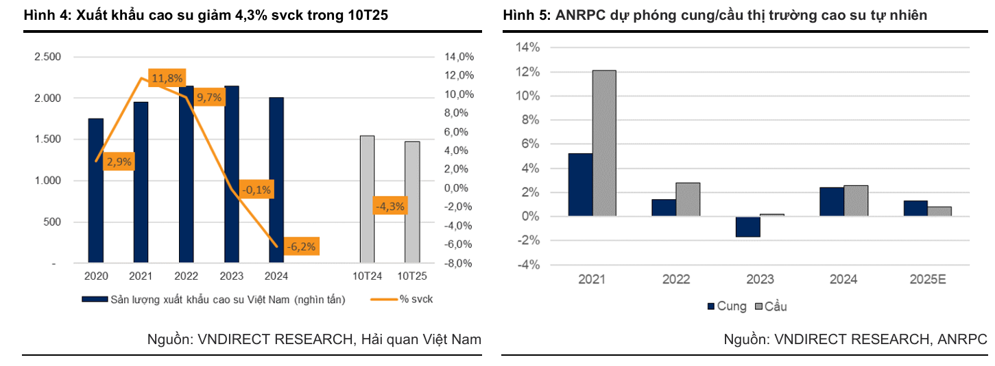 Diễn biến giá cao su thế giới quay đầu giảm mạnh đã tạo sức ép lên các giả định trước đây. Giá cao su đã giảm 16% từ đầu năm 2025 đến nay, do lo ngại căng thẳng thương mại và nhu cầu suy yếu từ Trung Quốc, quốc gia nhập khẩu cao su lớn nhất thế giới, đang đối mặt với dư thừa công suất ô tô. Sau mùa cao điểm Quý 3/2025, xuất khẩu cao su của Việt Nam cũng bắt đầu chững lại.