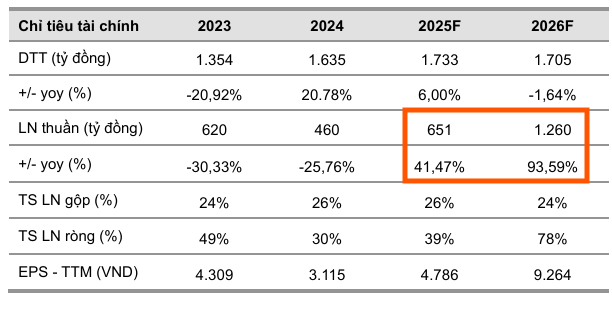 Đối với năm 2026, VCBS dự phóng doanh thu đạt khoảng 1,705 tỷ đồng (-1.64%) nhưng lợi nhuận thuộc về cổ đông công ty mẹ sẽ tăng trưởng đột biến, đạt 1,260 tỷ đồng (+93,59% so với cùng kỳ), tương ứng EPS là 9,264 VNĐ/cổ phiếu, nhờ vào sự phục hồi mạnh mẽ của dòng tiền đền bù đất.