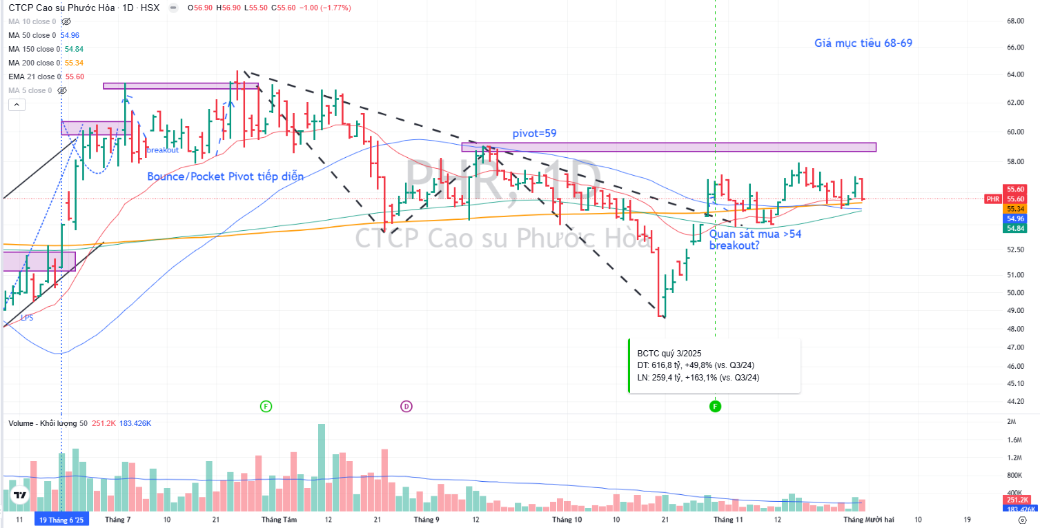 Sau khi khuyến nghị Mua PHR ở vùng giá 54,000 bởi điểm mua breakout đường trendline, cổ phiếu vẫn đang tích lũy quanh MA50 ngày, chờ điểm breakout mẫu hình Hai Đáy, với điểm pivot là 59,000 đồng.