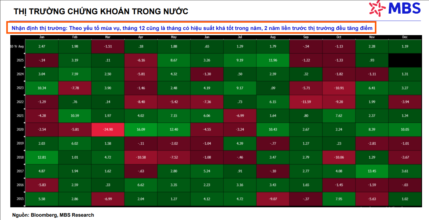 Thị trường chứng khoán Việt Nam vừa khép lại tháng 11 tương đối tích cực với chỉ số VN-Index phục hồi ba tuần liên tiếp và đạt mức tăng 3.2%, diễn ra trong bối cảnh thị trường ở vùng trũng thông tin hỗ trợ và thanh khoản duy trì ở mức nền thấp. Mặc dù thị trường giảm ngay tuần đầu tiên trong chuỗi giảm 4 tuần liên tiếp kể từ vùng đỉnh 1,800 điểm, yếu tố mùa vụ đã phát huy tác dụng ở tháng 11. Theo thống kê lịch sử từ Công ty Chứng khoán MB (MBS), tháng 12 cũng là tháng có xác suất thị trường tăng điểm khá cao, đặc biệt là hai năm liền trước đó chỉ số đều ghi nhận tăng trưởng. MBS nhận định rằng, kết hợp với yếu tố mùa vụ, thị trường sẽ trở nên tích cực hơn ở nửa cuối tháng 12 khi các thông tin hỗ trợ quan trọng hội tụ.