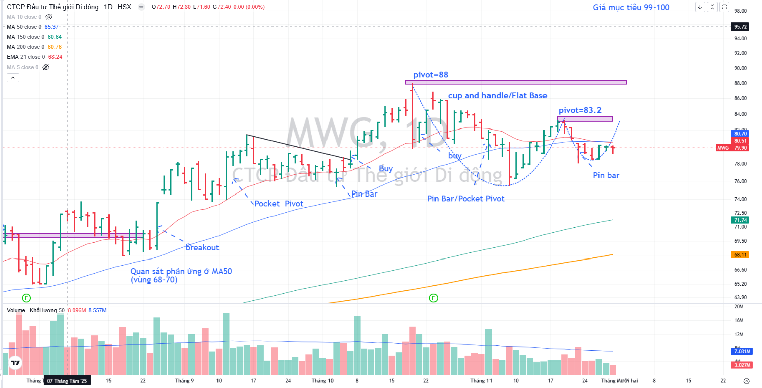 MWG đang xây Nền Giá Phẳng với điểm pivot là 88,000 hoặc Chiếc Cốc Tay Cầm với điểm pivot là 83,200 đồng. Sau khi khuyến nghị mua gom MWG ở vùng giá 77-78,000 đồng, nhà đầu tư chờ đợi điểm breakout nền giá để tiếp tục mở vị thế mua.