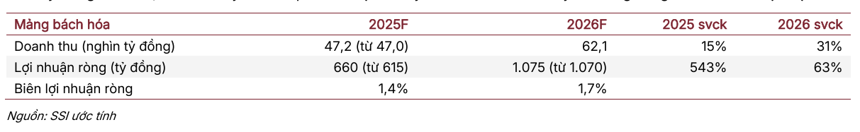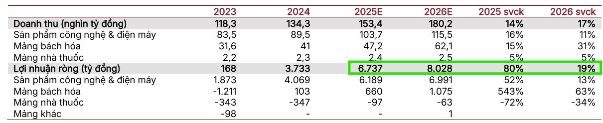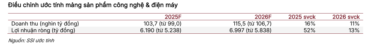 SSI cũng điều chỉnh tăng đáng kể dự báo lợi nhuận mảng này, kỳ vọng tăng trưởng vững chắc nhờ chu kỳ thay mới sản phẩm và các chính sách hỗ trợ như giảm 2% thuế GTGT đối với sản phẩm công nghệ & điện máy từ tháng 7/2025 đến hết năm 2026.