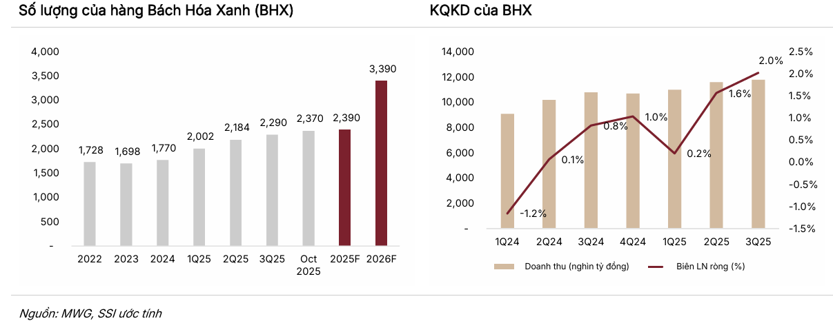 SSI đánh giá BHX sẽ đóng vai trò chủ lực trong tăng trưởng dài hạn của MWG, với kế hoạch mở mới 620-1,000 cửa hàng trong giai đoạn 2025-2026 và hưởng lợi từ chính sách thu thuế mới đối với hộ kinh doanh cá thể, thúc đẩy sự dịch chuyển từ kênh bán lẻ truyền thống sang hiện đại.