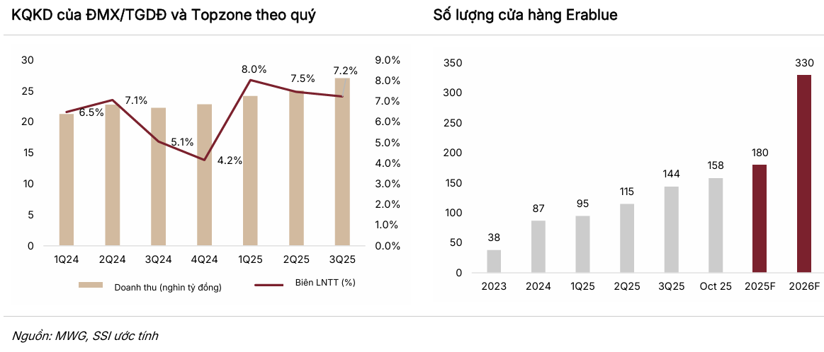Cụ thể, SSI điều chỉnh tăng dự báo lợi nhuận ròng cho năm 2025-2026 lần lượt lên 6,700 tỷ đồng (+80% yoy, từ 5,830 tỷ đồng) và 8 nghìn tỷ đồng (+19% yoy, từ 6,880 tỷ đồng). Lợi nhuận Q4/2025 dự báo đạt 1,700 tỷ đồng (+100% yoy). Mặc dù lợi nhuận được dự báo tiếp tục lập đỉnh mới trong năm 2025, SSI kỳ vọng MWG vẫn có thể duy trì tăng trưởng bền vững trong 2026.