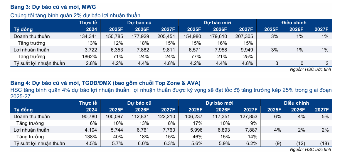 Dựa trên kết quả vượt trội, HSC đã tăng bình quân 5% dự báo doanh thu thuần và 3% lợi nhuận thuần cho chuỗi TGDĐ & ĐMX giai đoạn 2025-2027, đồng thời nâng giả định thị phần điện thoại di động của công ty lên 60% trong năm 2025.