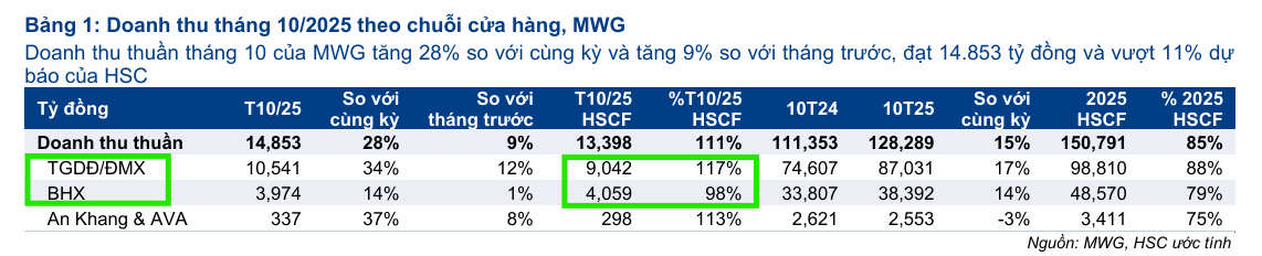 Trong tháng 10/2025, doanh thu thuần hợp nhất của MWG đạt 14,853 tỷ đồng, tăng 28% so với cùng kỳ, với chuỗi TGDĐ & ĐMX đạt doanh thu ước tính 10,500 tỷ đồng (tăng 34% so với cùng kỳ) – mức cao nhất theo tháng kể từ tháng 2/2022.