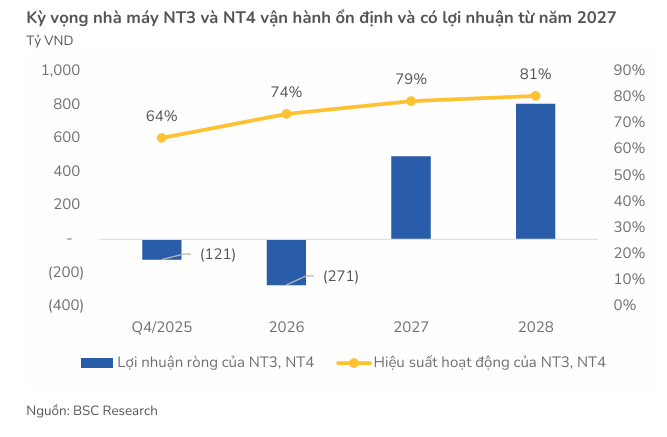 Theo BSC, sự thay đổi này được kỳ vọng sẽ giúp tổng lợi nhuận lũy kế của NT3 và NT4 giai đoạn 2025 – 2028 tăng gấp đôi, từ 450 tỷ VND lên 900 tỷ VND, đồng thời giảm mức lỗ dự kiến của hai nhà máy này trong năm 2025 từ 400 tỷ VND xuống còn 121 tỷ VN.