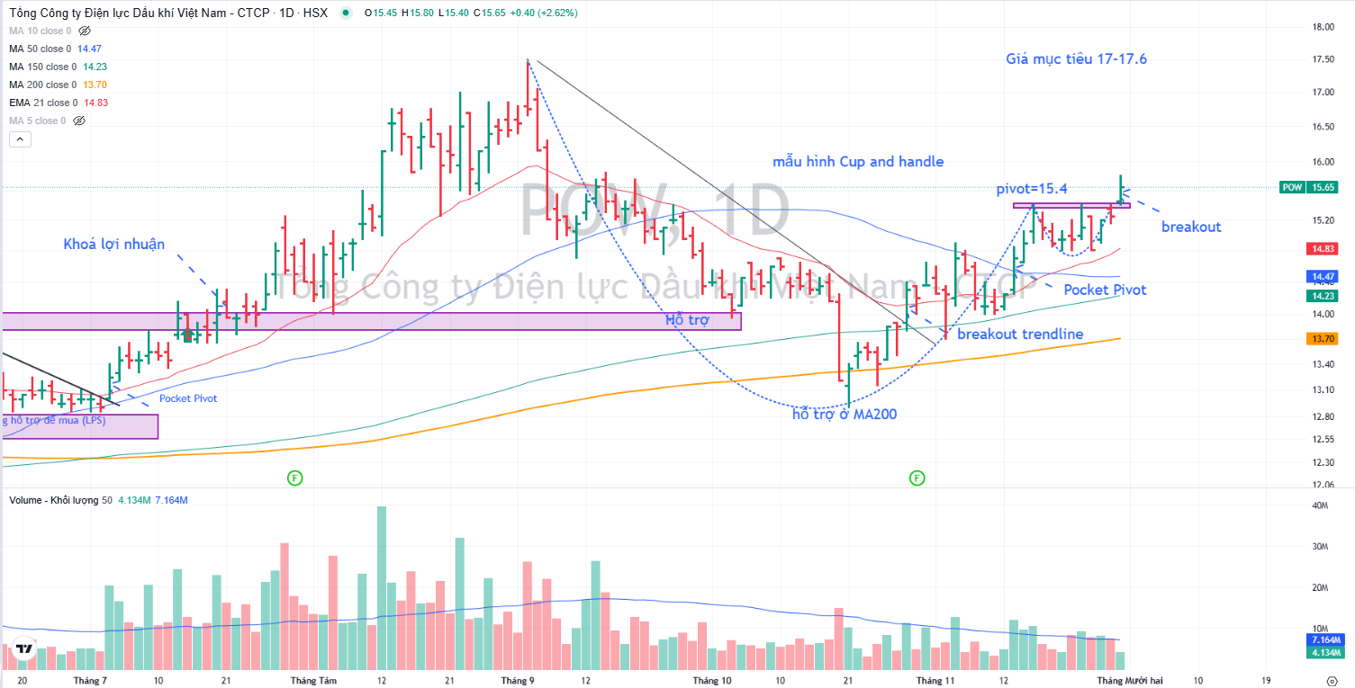 Sau điểm mua breakout đường trendline giảm vào ngày 29.10.2025, POW tiếp tục có điểm mua Pocket Pivot vào ngày 13.11.2025. Kỳ vọng POW có thể quay trở về đỉnh cũ 17,000 đồng.