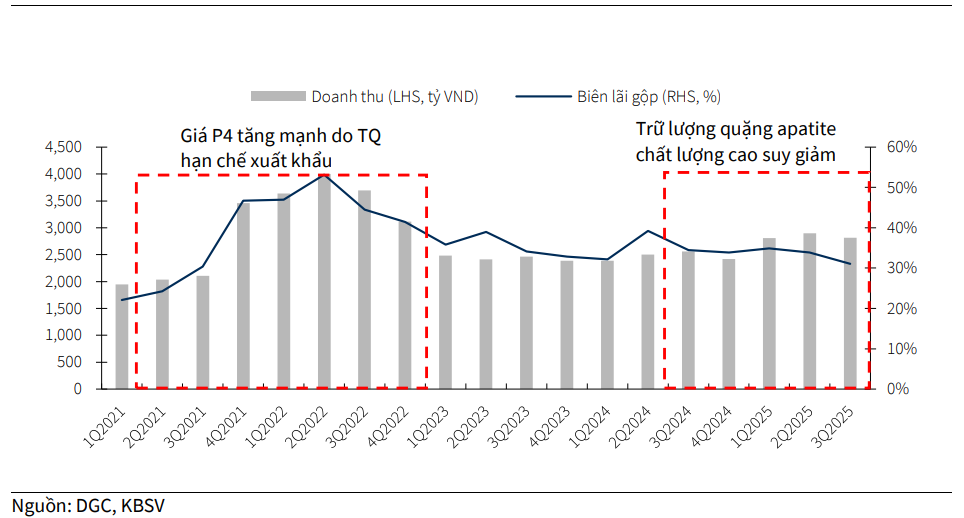 Tuy nhiên, KBSV kỳ vọng giấy phép khai thác quặng apatite tại Khai trường 25 sẽ được phê duyệt trong nửa cuối năm 2025 và đi vào khai thác từ nửa cuối năm 2026, giúp bổ sung nguồn nguyên liệu đầu vào ổn định và cải thiện biên lãi gộp mảng P4 trong dài hạn.
