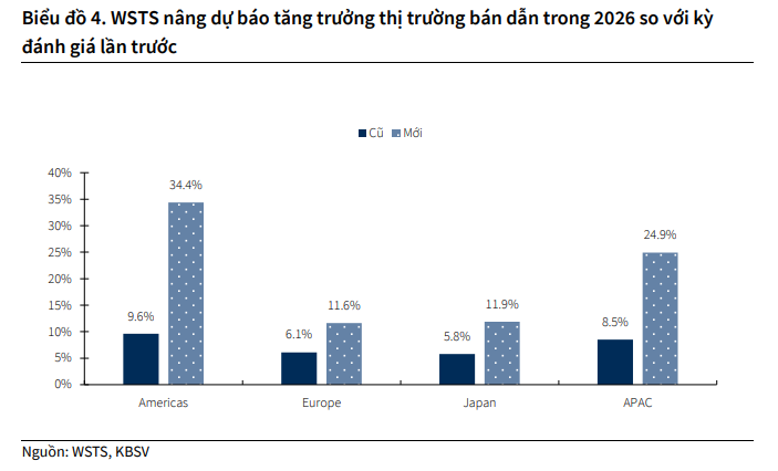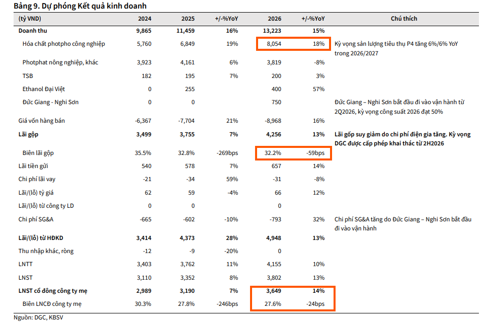 Triển vọng tiêu thụ phốt pho vàng (P4) của DGC được KBSV đánh giá sẽ khởi sắc hơn trong năm 2026, nhờ vào sự gia tăng mạnh mẽ của nhu cầu từ lĩnh vực bán dẫn. Tổ chức Thống kê Công nghiệp Bán dẫn Thế giới (WSTS) đã điều chỉnh tăng mạnh dự phóng tăng trưởng lĩnh vực này lên 26.3% trong năm 2026, cao hơn nhiều so với mức kỳ vọng 8.5% trước đó, phản ánh doanh số thị trường quý III/2025 tăng mạnh. Nhóm các sản phẩm linh kiện bán dẫn riêng lẻ, vốn là nhóm sử dụng P4 nhiều nhất, cũng được dự phóng tăng 8.7% so với cùng kỳ.
