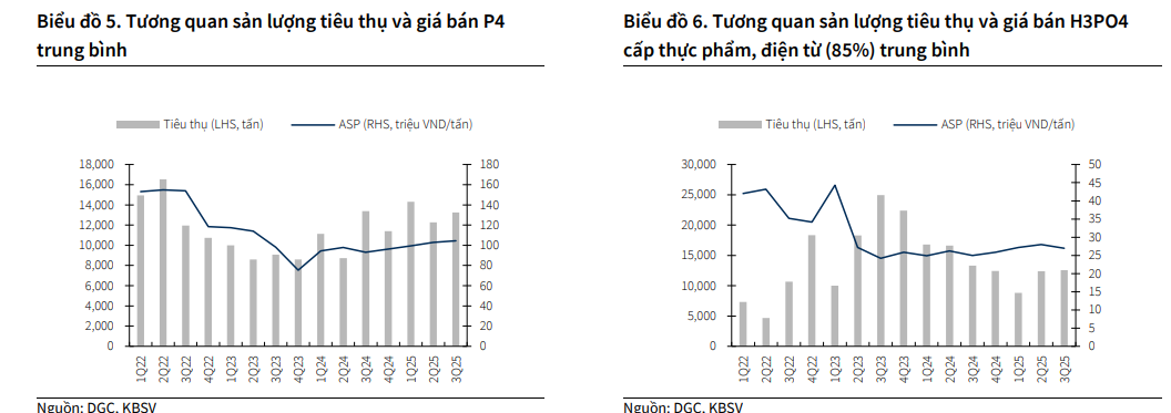 Ban lãnh đạo DGC cũng chia sẻ rằng các khách hàng thuộc lĩnh vực bán dẫn sẵn sàng chia sẻ một phần chi phí tăng thêm từ thuế, mặc dù việc đàm phán giá với nhóm khách hàng nông nghiệp khó khăn hơn. KBSV ước tính sản lượng tiêu thụ P4 của DGC sẽ tăng lần lượt 18%, 6% và 6% so với cùng kỳ trong các năm 2025, 2026 và 2027.