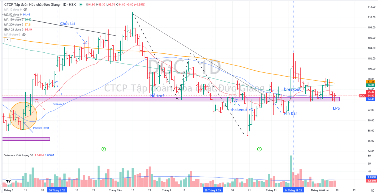 Trên đồ thị, RS của DGC là 49, hoạt động ở mức trung bình trên thị trường. Hiện chưa có sóng ngành công nghệ để hỗ trợ giá cổ phiếu, tuy nhiên DGC đang ở vùng giá hỗ trợ quanh 94,000-95,000. Đây là vùng giá có thể mua được.