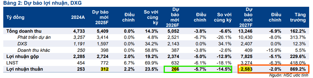 Tuy nhiên, dự báo lợi nhuận thuần năm 2026 và 2027 được điều chỉnh giảm lần lượt 5.7% và 2%, xuống còn 266 tỷ đồng và 2,583 tỷ đồng, chủ yếu do đóng góp từ DXS thấp hơn so với dự kiến trước đó. HSC kỳ vọng DXG sẽ bắt đầu ghi nhận doanh thu từ dự án Gem Sky World từ năm 2026 và dự án The Privé từ năm 2027.