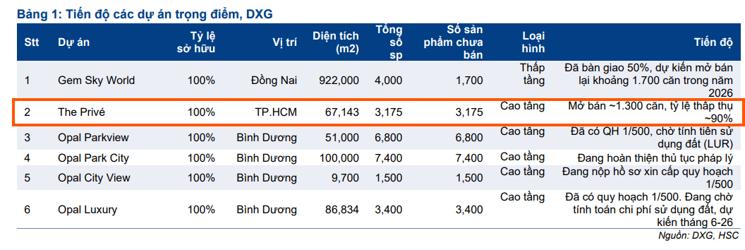 Dự án The Privé tại TP.HCM là tâm điểm tăng trưởng của DXG. HSC ghi nhận công ty đã mở bán khoảng 1,300 căn hộ tại The Privé, tất cả đều đã được bán với giá bán bình quân 135 triệu đồng/m². Cụ thể, Giai đoạn 1 (1,025 căn hộ) đã được đặt mua 100%.