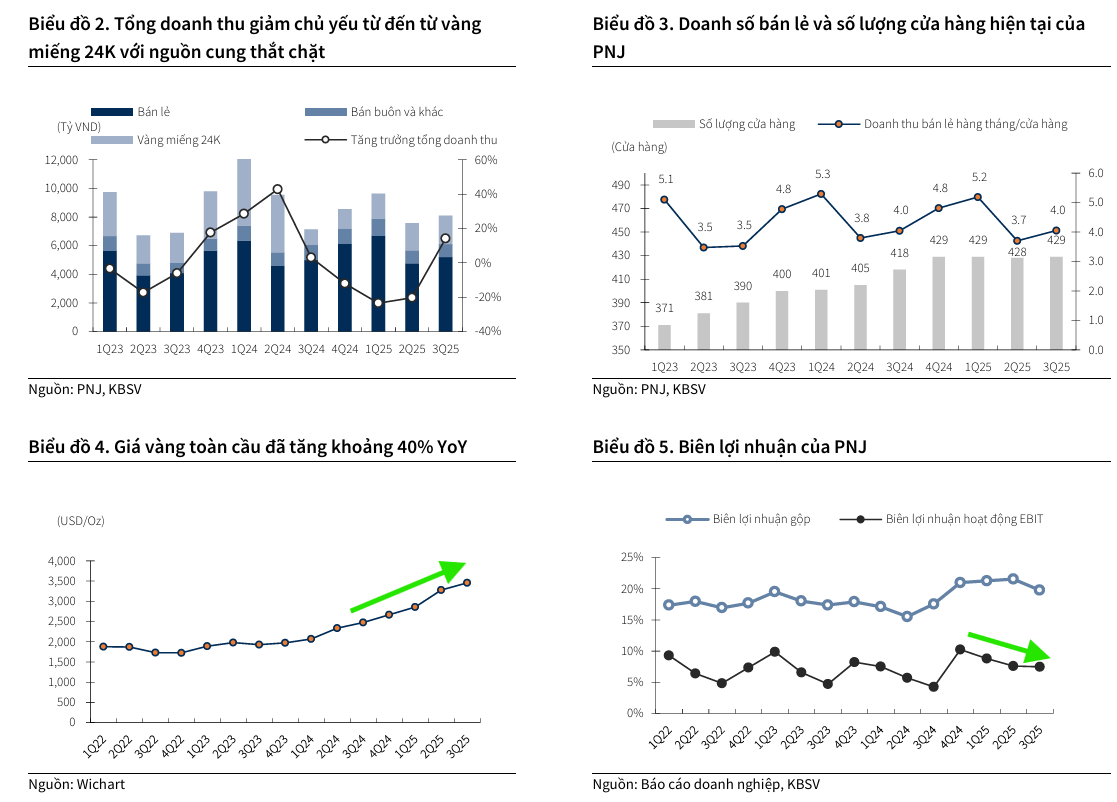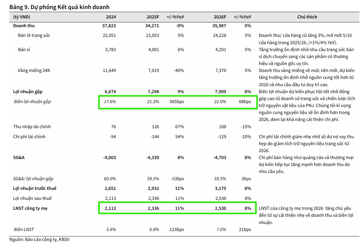 Với hoạt động kinh doanh trang sức cốt lõi và quy mô vốn đáp ứng được quy định, PNJ được kỳ vọng sẽ tận dụng cơ hội này để gia tăng biên lợi nhuận hoạt động, giúp duy trì tốc độ tăng trưởng LNST công ty mẹ cao hơn so với doanh thu. KBSV ước tính LNST công ty mẹ trong quý 4/2025 và quý 1/2026 sẽ tăng trưởng lần lượt 1% và 15% YoY.