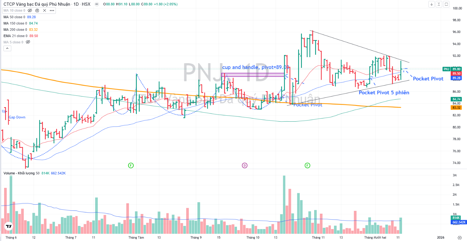 Trên đồ thị, RS của PNJ là 86, hoạt động vượt trội trên thị trường. PNJ có điểm mua Pocket Pivot vào ngày 12.12.2025 bất chấp thị trường chung giảm điểm.