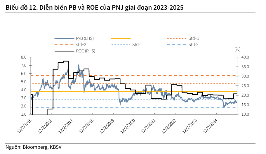 PNJ hiện đang được giao dịch với mức P/E dự phóng 2026 là 12 lần, thấp hơn so với mức trung bình 5 năm của doanh nghiệp. KBSV cho rằng đây là mức định giá hợp lý, đặc biệt khi tăng trưởng CAGR của LNST trong giai đoạn 2025-2027 đạt 7%/năm, tương đương với hệ số PEG là 0.5, cho thấy triển vọng đầu tư khá hấp dẫn.