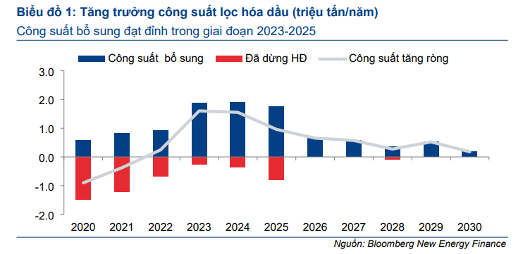 Động lực chính đến từ mức chênh lệch giá dầu thô và dầu sản phẩm (crack spreads) cao hơn, bất chấp giá dầu Brent có xu hướng suy yếu. Sự chênh lệch này được hỗ trợ nhờ nguồn cung dầu thô nặng giảm (do các lệnh trừng phạt lên Nga) và việc hạn chế bổ sung công suất lọc dầu toàn cầu sau năm 2025. Triển vọng đối với crack spread có vẻ thuận lợi về mặt cấu trúc trong ngắn hạn, cho thấy nhu cầu cơ bản đối với các sản phẩm lọc dầu vẫn vững chắc.