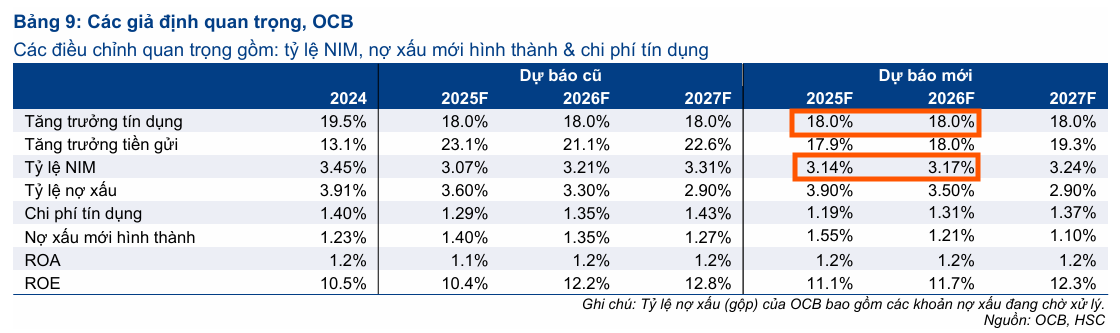 Định giá & khuyến nghị: HSC nâng khuyến nghị lên Mua vào, giá mục tiêu 14,900 đồng/cp (+23% tiềm năng); OCB đang giao dịch P/B ~0.9 lần, thấp hơn 30% so với bình quân nhóm ngân hàng tư nhân, được coi là hấp dẫn.