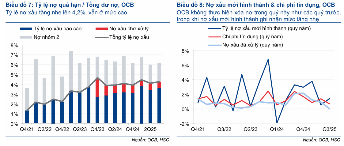Mối lo ngại hàng đầu vẫn là chất lượng tài sản. Tỷ lệ nợ xấu báo cáo tăng nhẹ lên 3.6% trong Quý 3/2025, và nợ xấu ở phân khúc bán lẻ vẫn là thách thức chính. Tuy nhiên, HSC nhận thấy các dấu hiệu cải thiện, khi tỷ lệ nợ nhóm 2 giảm xuống 1.9%, thấp hơn đáng kể so với mức bình quân giai đoạn chất lượng tài sản suy yếu. Tỷ lệ nợ xấu mới hình thành tuy tăng nhẹ nhưng vẫn thấp hơn đáng kể so với bình quân giai đoạn sau năm 2022.