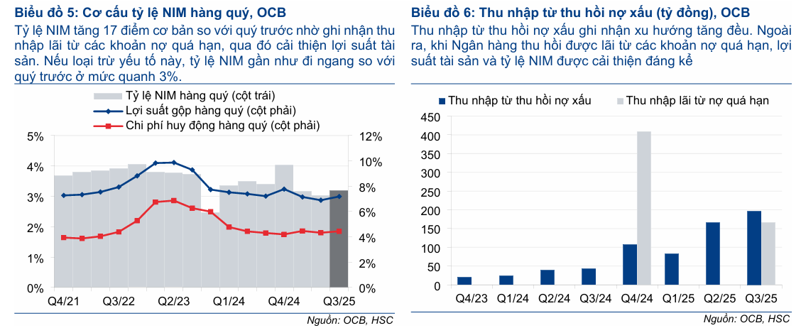 Lợi nhuận trước thuế (LNTT) của OCB trong Quý 3/2025 và 9 tháng đầu năm 2025 tăng mạnh lần lượt 3.5 lần và 34% so với mức nền thấp cùng kỳ. LNTT 9 tháng đầu năm 2025 đã hoàn thành 81% dự báo cả năm trước đó của HSC, vượt kỳ vọng chủ yếu nhờ chi phí dự phòng thấp hơn dự báo sau hoạt động thu hồi nợ xấu mạnh mẽ và tỷ lệ NIM tốt hơn kỳ vọng.