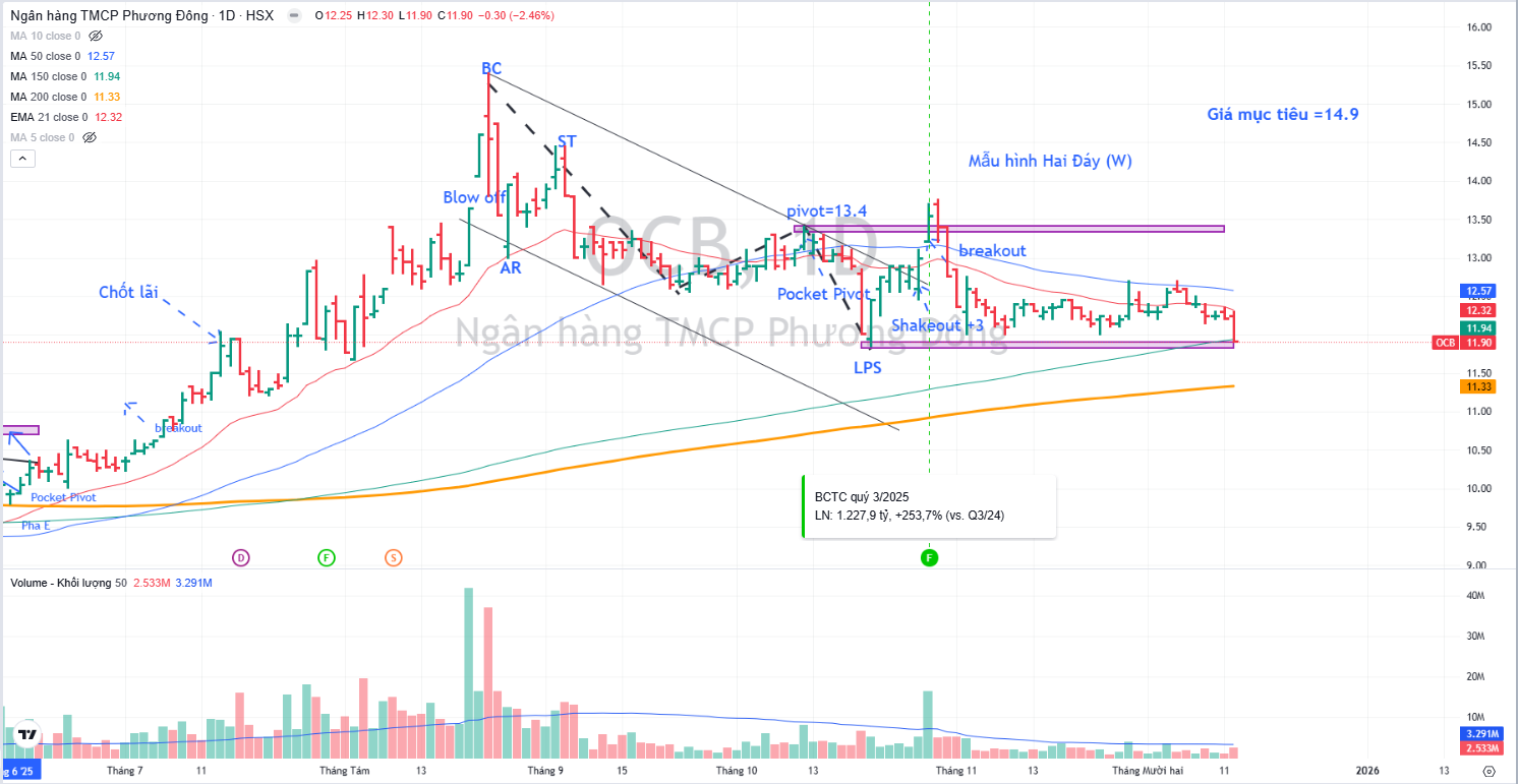Trên đồ thị, RS của OCB là 71, hoạt động khá tốt trong nhóm ngân hàng. Sau khi breakout thất bại mẫu hình Hai Đáy (điểm pivot 13,400 đồng), OCB đang tích lũy trở lại và giá hiện đang được hỗ trợ bởi MA150 ngày tại 11,900 đồng. Elibook Team dù không nắm giữ OCB nhưng cho rằng cổ phiếu có thể hồi phục trở lại trong thời gian tới.