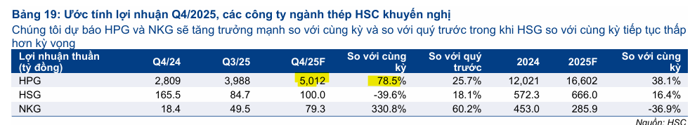 HSC dự báo lợi nhuận Q4/2025 của HPG đạt 5 nghìn tỷ đồng, tăng 79% so với cùng kỳ và tăng 26% so với quý trước, chủ yếu được thúc đẩy bởi phân khúc HRC.