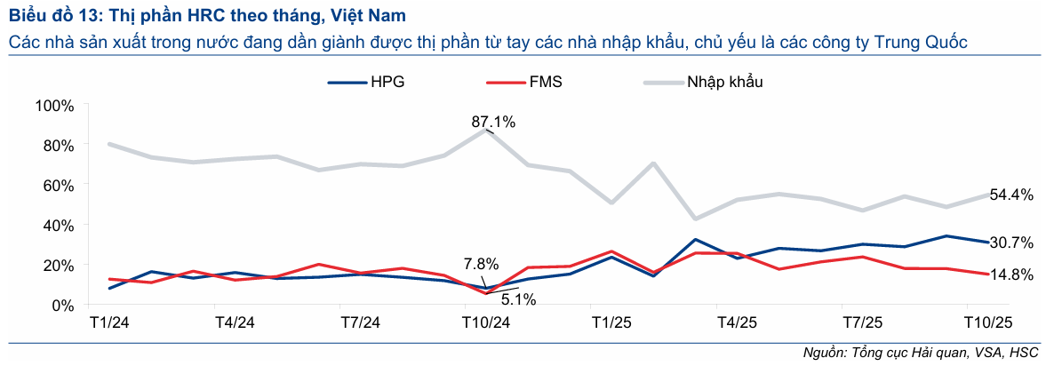 Nhờ chính sách bảo hộ này, HPG đã giành thêm thị phần HRC trong nước, ước tính đạt khoảng 27% trong 10 tháng đầu năm và tiếp tục cải thiện lên 30.7% trong tháng 10/2025. Ngoài ra, sản lượng tiêu thụ thép xây dựng cũng đạt mức tăng trưởng tích cực 8.2% so với cùng kỳ, nhờ đầu tư công và sự phục hồi của ngành bất động sản.