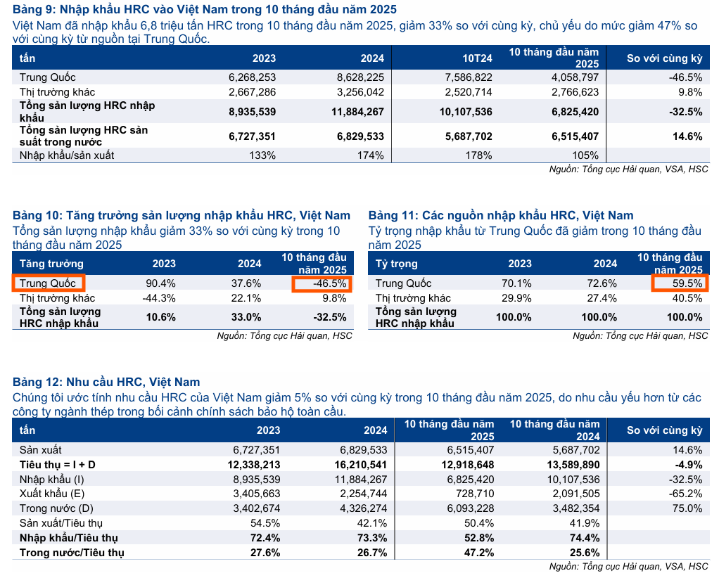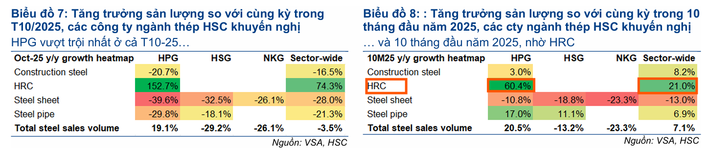 Thị trường tiếp tục phân hóa theo cơ cấu sản phẩm. Phân khúc Thép cuộn cán nóng (HRC) là động lực tăng trưởng chính, tăng 21% so với cùng kỳ lên 6.7 triệu tấn trong 10 tháng đầu năm 2025. Đà tăng này được thúc đẩy bởi hiệu quả của chính sách áp thuế chống bán phá giá (CBPG) đối với HRC Trung Quốc. Riêng đối HPG, sản lượng tiêu thụ HRC tăng 67% yoy trong 10 tháng đầu năm.
