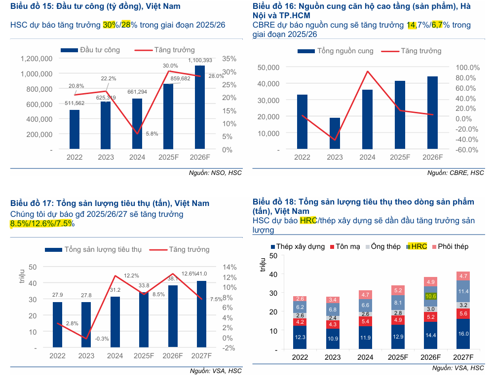 HSC dự báo tổng sản lượng tiêu thụ thép toàn ngành sẽ tăng 12.6% trong năm 2026, lên 38.1 triệu tấn. Dự báo này được củng cố bởi hai trụ cột vĩ mô quan trọng.