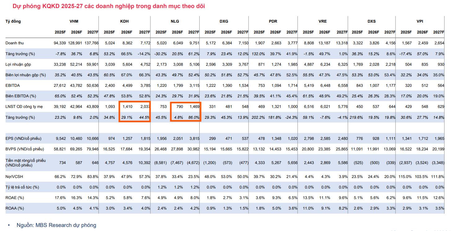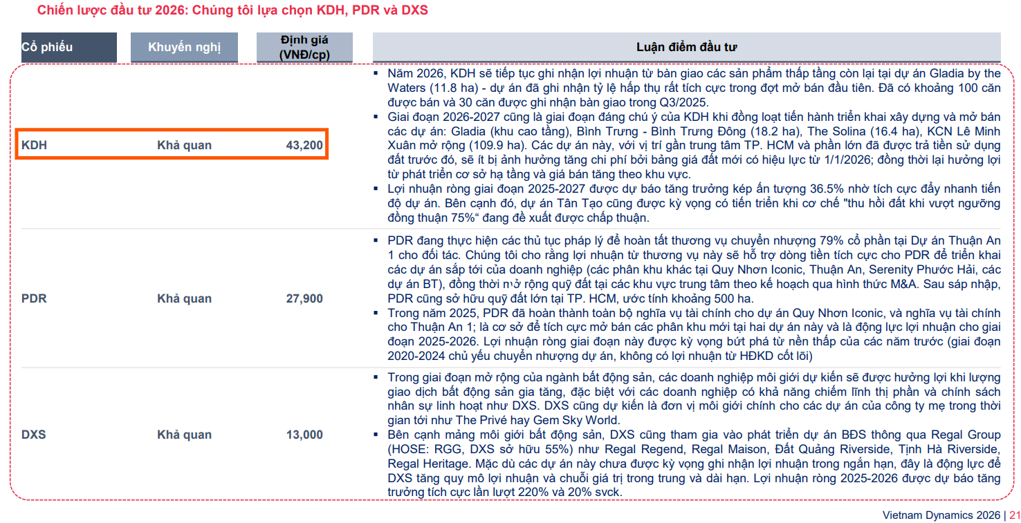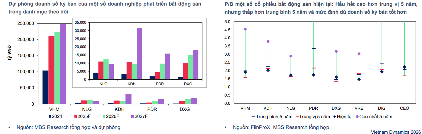 Trong bối cảnh định giá P/B của hầu hết các cổ phiếu BĐS đang thấp hơn hoặc tương đương so với trung bình 5 năm, và doanh số ký bán/dòng tiền của các doanh nghiệp tích cực hơn nhiều so với thời điểm định giá cao trước đây, MBS tin rằng cổ phiếu BĐS vẫn còn tiềm năng tăng giá. MBS lựa chọn KDH, PDR và DXS cho chiến lược đầu tư ngành bất động sản năm 2026.