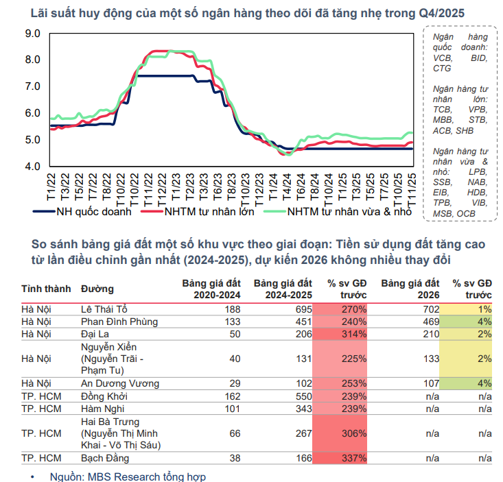 4. Lãi suất ở mức thấp: Dù lãi suất cho vay mua nhà có dấu hiệu tăng nhẹ vào cuối năm 2025, MBS nhận định mặt bằng lãi suất năm 2026 sẽ cao hơn 2025 nhưng mức tăng không lớn và không tác động quá tiêu cực. Lãi suất thấp vẫn là động lực thúc đẩy người mua ở thực đưa ra quyết định nhanh hơn, mặc dù có thể làm chững lại hoạt động đầu cơ vốn nhạy cảm với chi phí vốn.