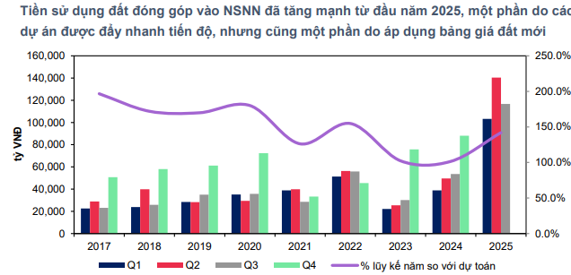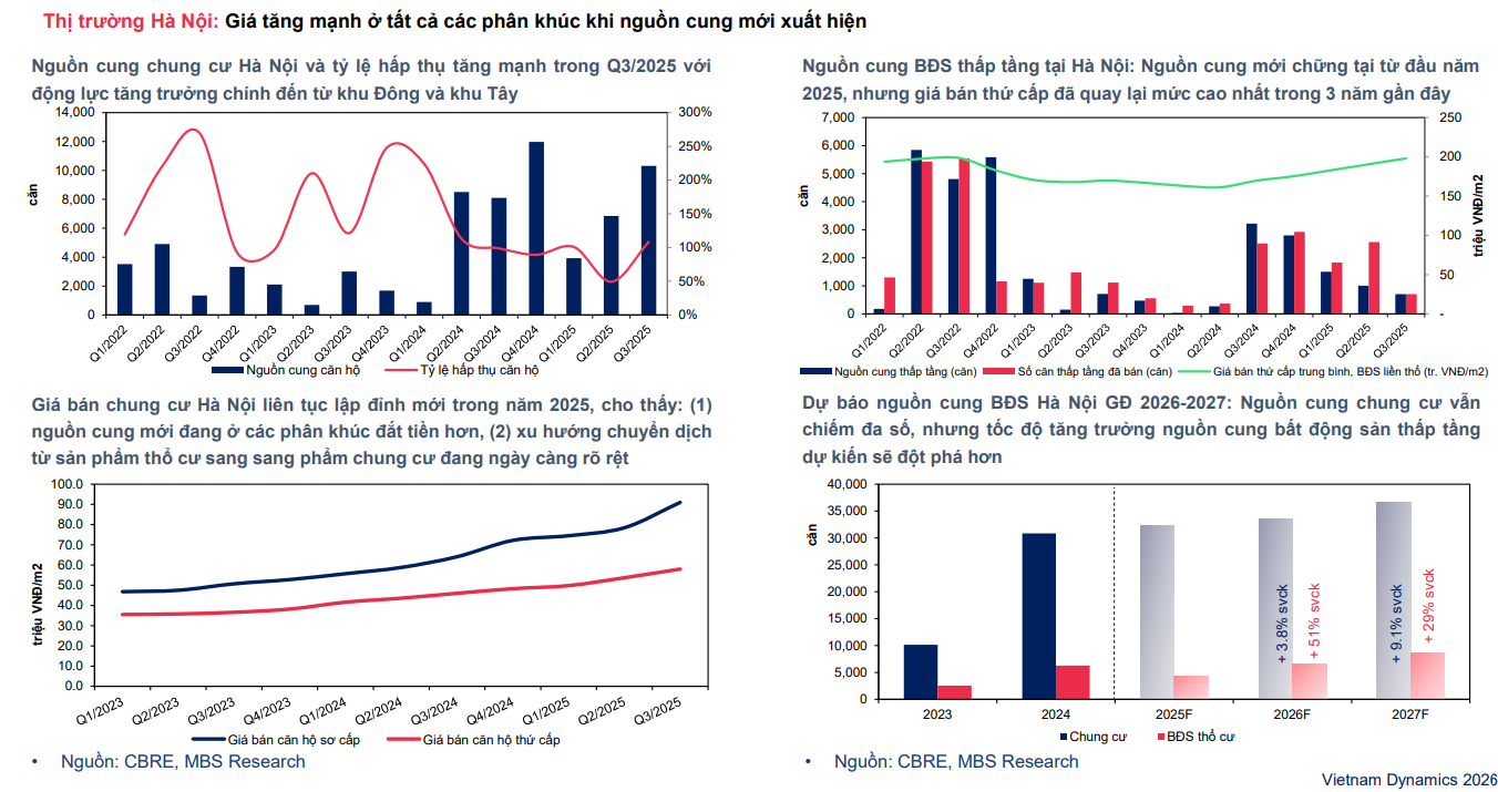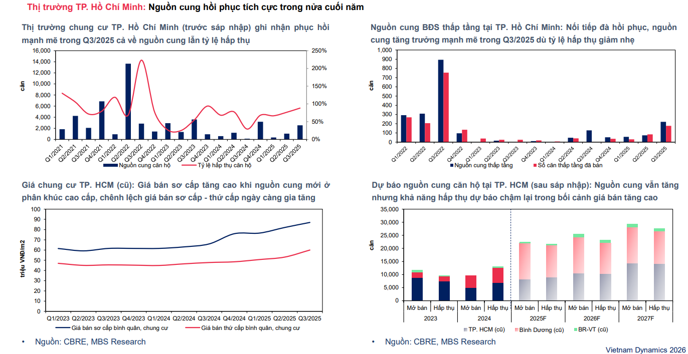 3. Nguồn cung lớn dự kiến được đưa ra thị trường: Các doanh nghiệp đang tích cực đẩy nhanh tiến độ pháp lý, thể hiện qua việc thu ngân sách nhà nước về tiền sử dụng đất trong 9 tháng đầu năm 2025 đạt mức kỷ lục. MBS kỳ vọng giai đoạn 2026-2027 sẽ ghi nhận nguồn cung BĐS lớn, đặc biệt tại khu vực phía Nam (TP. Hồ Chí Minh sau sáp nhập) và phía Bắc (Hà Nội và các tỉnh lân cận).