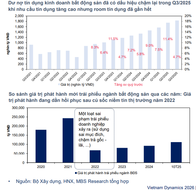 - Động lực chính: Chính phủ hỗ trợ pháp lý, nguồn cung tăng mạnh, thị trường trái phiếu doanh nghiệp hồi phục (+103.8% giá trị phát hành mới trong 10 tháng 2025), tạo điều kiện vốn cho doanh nghiệp mở rộng quỹ đất và dự án.