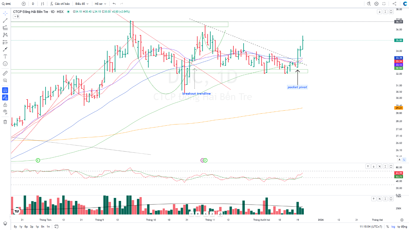 Trên biểu đồ kỹ thuật, DHC có RS=92, mức hoạt động tốt trên thị trường. DHC đã giữ giá khá tốt bất chấp nhịp chỉnh sâu của thị trường, và DHC cũng đã xuất hiện điểm mua Pocket Pivot vào ngày 19.12.2025, khả năng cao sẽ có thể breakout vùng đỉnh cũ. Lưu ý, đây là mã tăng trưởng và có thể nắm dài hạn, nhưng DHC hoạt động riêng lẻ (không có sóng ngành bổ trợ), và được đánh chủ yếu bởi tăng trưởng kinh doanh từ hoạt động cốt lõi.