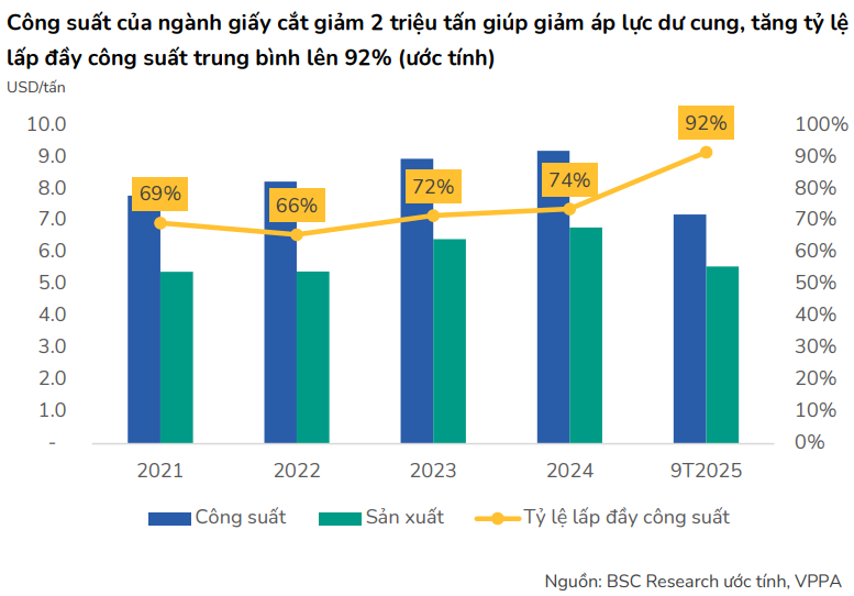 Trong 9T2025, sản lượng giấy toàn ngành đạt 5.57 triệu tấn (-2.8% YoY), nhưng tỷ lệ lấp đầy công suất tăng mạnh lên 92%, so với 74% năm 2024. Điều này phản ánh tình trạng thiếu hụt nguồn cung rõ rệt và tạo lợi thế lớn cho các doanh nghiệp có nhà máy quy mô lớn, vận hành ổn định và đáp ứng tiêu chuẩn môi trường như DHC.