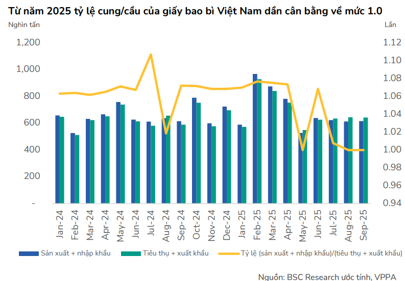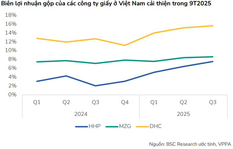 Ở chiều cầu, tiêu thụ giấy trong 9T2025 đạt 6.41 triệu tấn (+12.7% YoY), nhờ các ngành xuất khẩu như dệt may, da giày, nông sản và thủy sản đẩy mạnh đơn hàng trước thời điểm thuế quan mới của Mỹ có hiệu lực từ 1/8/2025. Trong bối cảnh cung giảm và cầu tăng, giá bán giấy và bao bì phục hồi rõ rệt, tạo điều kiện để biên lợi nhuận toàn ngành cải thiện, đặc biệt tại nhóm doanh nghiệp dẫn đầu.