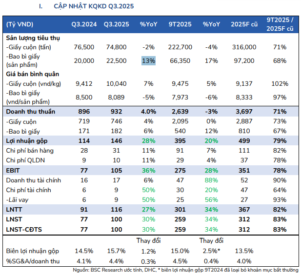 BSC (02/12/2025) duy trì khuyến nghị Mua đối với cổ phiếu DHC và nâng 10% giá mục tiêu lên mức 37,600 đồng mỗi cổ phiếu, sau khi điều chỉnh tăng giả định biên lợi nhuận gộp giai đoạn 2025-2027 lên mức khoảng 15% nhờ bối cảnh cung – cầu ngành giấy cải thiện tích cực.