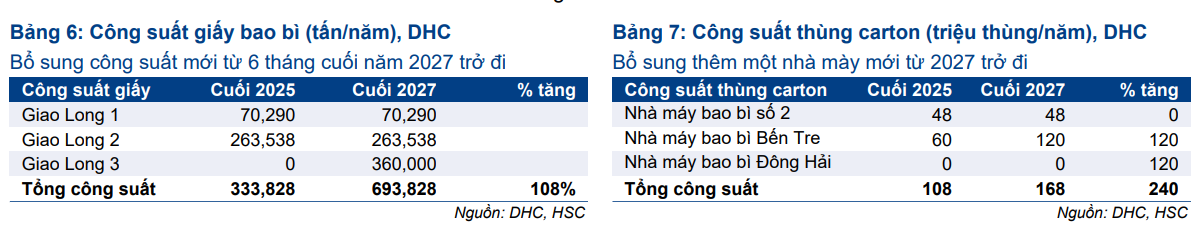Về trung hạn, tăng trưởng của DHC gắn liền với kế hoạch mở rộng công suất giấy và bao bì. Theo HSC, tổng công suất giấy bao bì của DHC dự kiến tăng từ 333,828 tấn mỗi năm cuối 2025 lên 693,828 tấn mỗi năm cuối 2027, tương ứng mức tăng 108%, nhờ dự án Giao Long 3 với công suất 360,000 tấn mỗi năm dự kiến vận hành từ nửa cuối 2027.