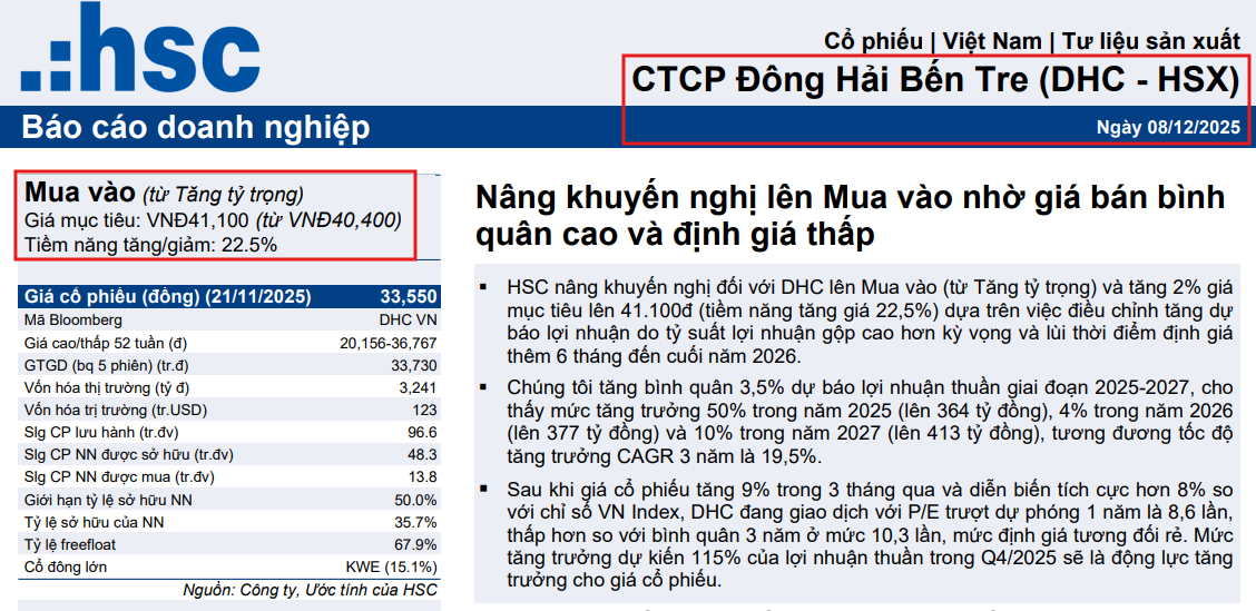 - KQKD & định giá: BSC (02/12/2025) duy trì khuyến nghị Mua đối với DHC với giá mục tiêu 37,600 đồng/cp (+20% tiềm năng). Trong kịch bản triển khai dự án Giao Long 3, giá mục tiêu có thể đạt 43,300 đồng/cp (+35%), phản ánh kỳ vọng biên lợi nhuận gộp duy trì quanh 15% và tăng trưởng lợi nhuận bền vững giai đoạn 2025-2027. HSC (8.12.2025) tăng nhẹ 2% giá mục tiêu lên 41,400đ (tiềm năng tăng giá 22.5%), nâng khuyến nghị lên MUA (từ Tăng tỷ trọng)
