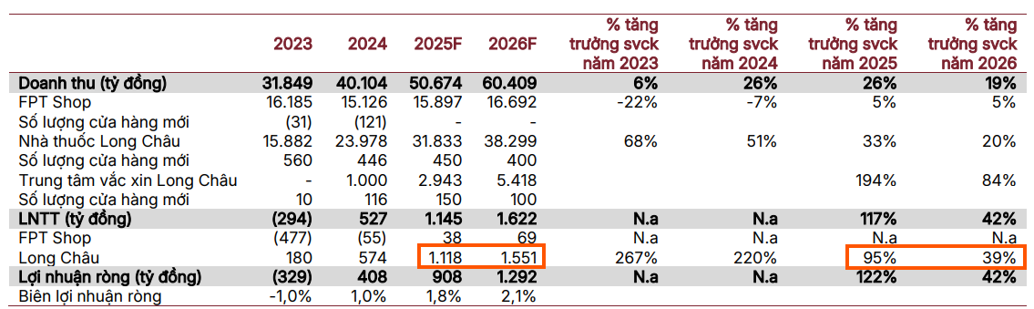 - Động lực tăng trưởng: Long Châu với 2,317 cửa hàng dẫn đầu thị trường dược phẩm hiện đại, hưởng lợi từ thay đổi pháp lý (kê đơn 90 ngày, siết thuốc giả); mảng tiêm chủng vắc xin đang mở rộng nhanh, tạo hệ sinh thái chăm sóc sức khỏe toàn diện.