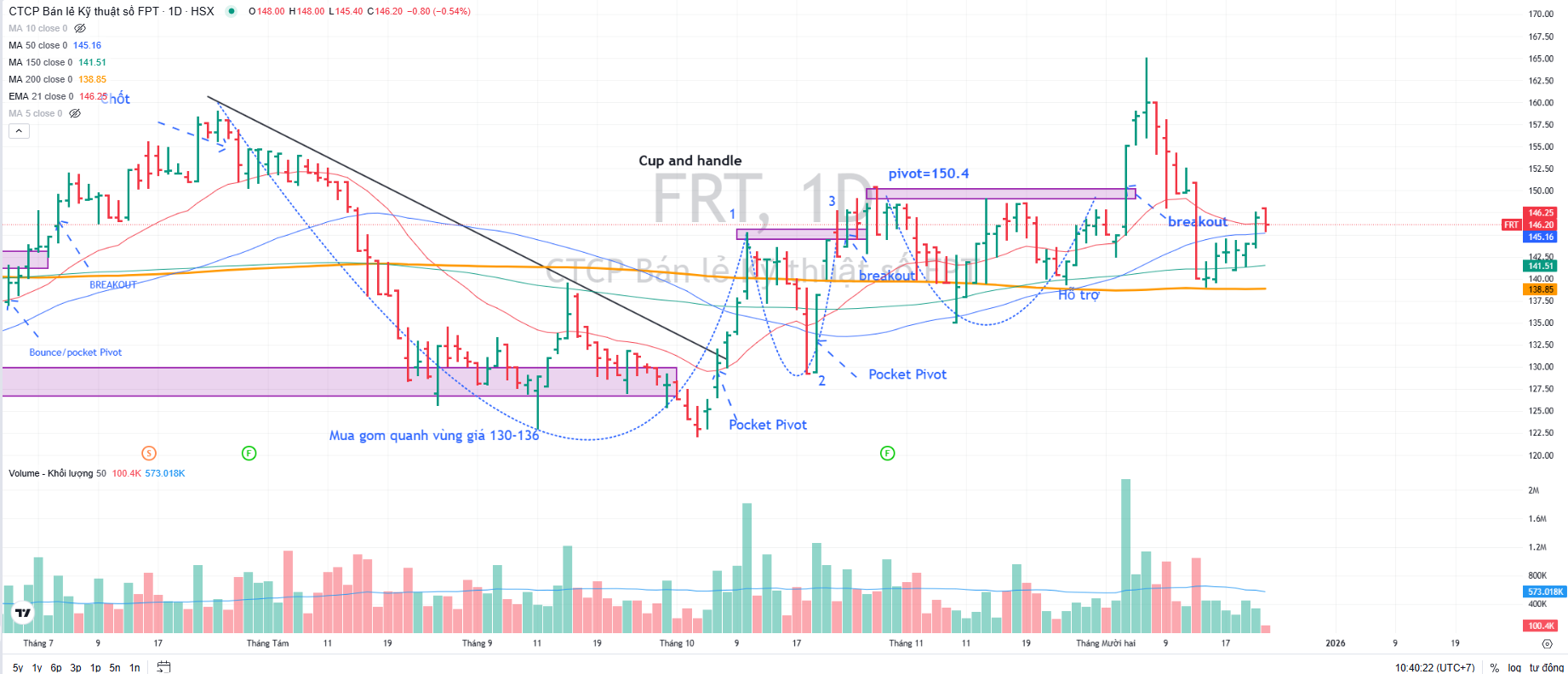 Trên đồ thị, RS của FRT là 76, hoạt động khá tốt trên thị trường. Sau khi breakout thất bại mẫu hình Chiếc Cốc Tay Cầm (điểm pivot=150,400), cổ phiếu thoái lùi về MA50 ngày và MA20 ngày, sau đó tìm thấy hỗ trợ.