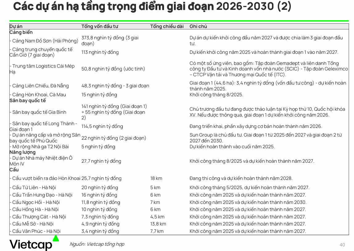 Các dự án trọng điểm như Đường sắt tốc độ cao Bắc – Nam (vốn đầu tư 1,714 nghìn tỷ đồng), sân bay quốc tế Long Thành giai đoạn 1 và mục tiêu đạt 5,000 km đường cao tốc vào năm 2030 sẽ là những động lực lan tỏa cho toàn nền kinh tế.